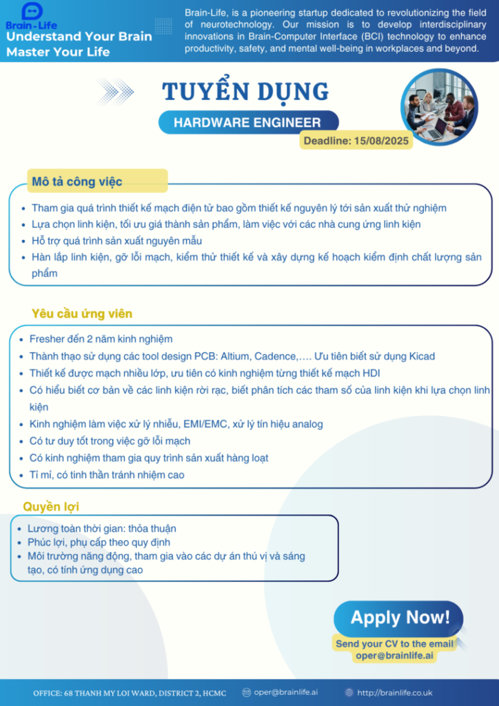 • Requirements: Fresher–2 years of experience, proficient in PCB tools (Altium, Cadence…)