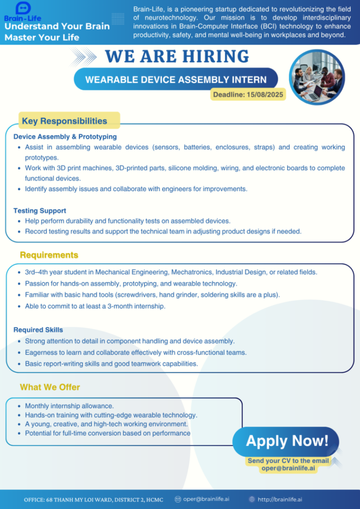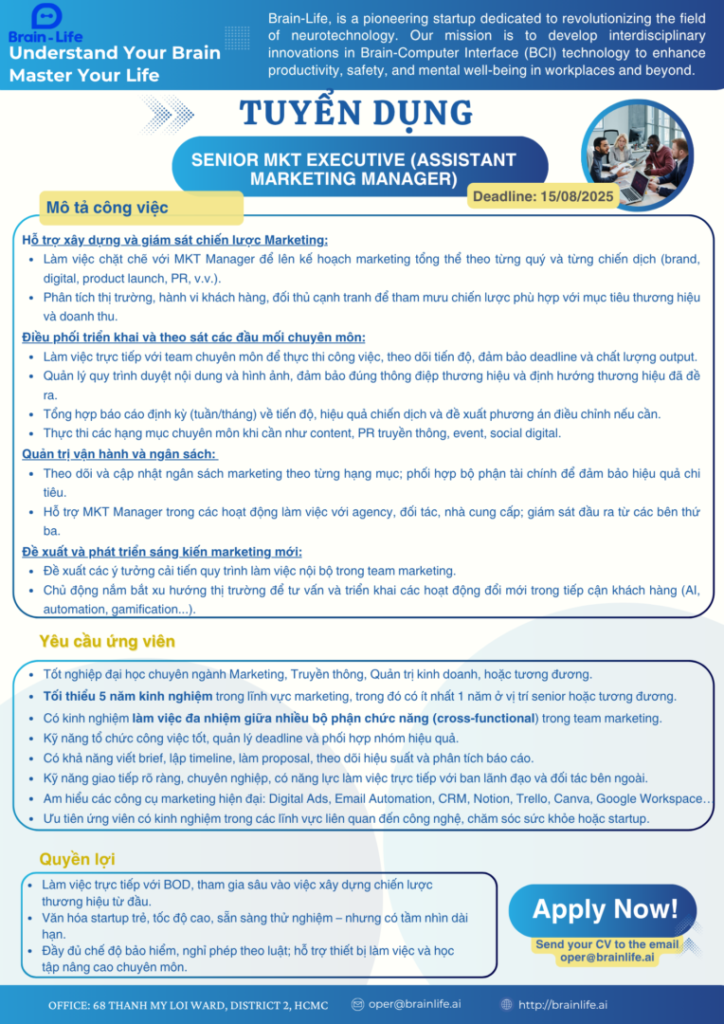 • Cách thức ứng tuyển: Gửi CV về oper@brainlife.ai (tiêu đề email: [Vị trí] – Họ tên)