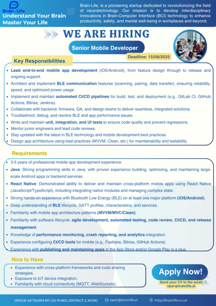 • Yêu cầu: 3-5 năm kinh nghiệm, thành thạo Java, React Native, BLE